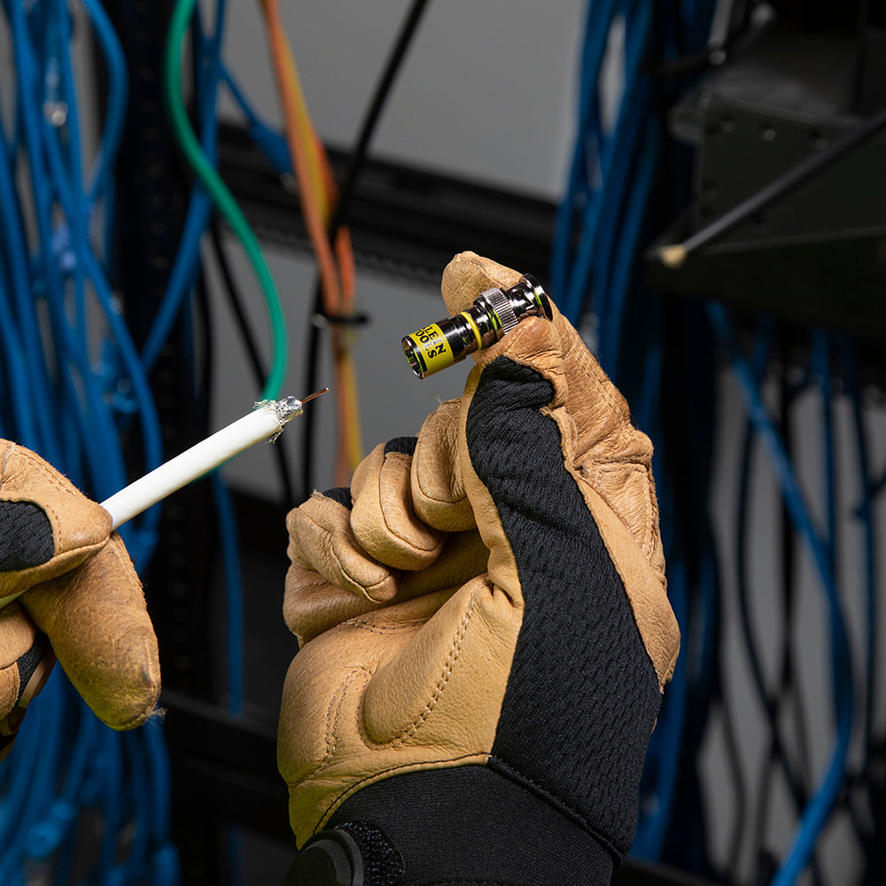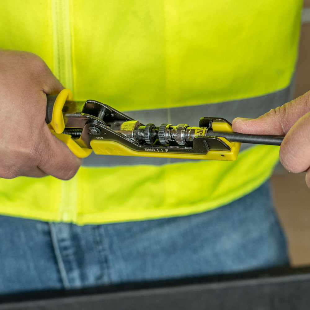 Klein's patented universal sleeve technology BNC connectors install up to 5x faster than other BNC compression connectors. Patented viewing windows in sleeve aid in proper seating. One connector fits all diameter variations within a cable series. This patented sleeve design provides the excellent holding power and signal strength you demand.